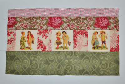 Piece together Section 3 as shown in diagram using a Scant 1/4″ seam allowance. Press seam allowances to one side, but use a press cloth and be very careful of the iron-on transfer images! Don’t put a hot iron directly on them! (Can you say, “Gooey Mess”?)