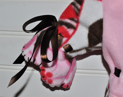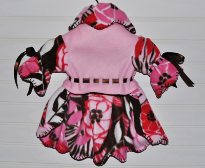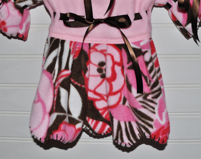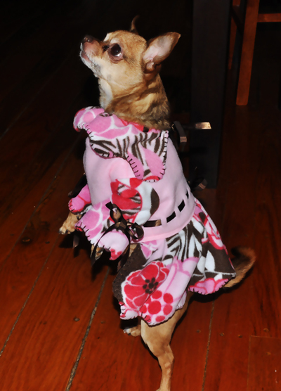 I love to name my patterns after my models and this pattern was named for Gabby, a sweet, rescued chihuahua. She was a marvelous model in her comfy, pink and brown floral fleece dress.