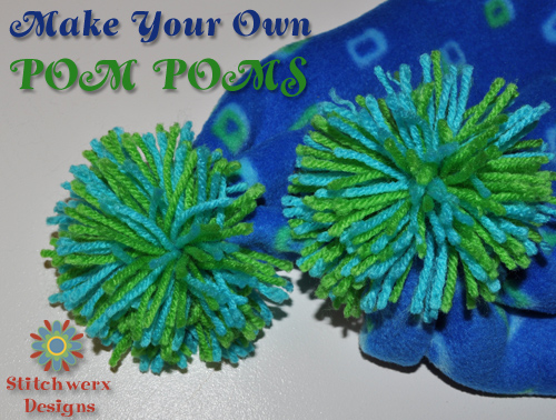 My daughter recently taught me this fabulous way to Make Your Own Pom Poms! Until now, my pom poms were not that great. I just wound the yarn around 3 or 4 fingers, tied it in the middle and clipped the ends. Sad, oh, so very sad, indeed! Now my Pom Poms are excellent!