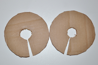 Cut these templates out, then cut a slit in the side and a smaller hole in the center. I used my handy X-Acto knife to cut the center holes because it is much easier than using scissors. This is a good time to cut a piece of yarn about 6-8″ long. Keep this handy for tying your pom pom.