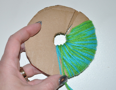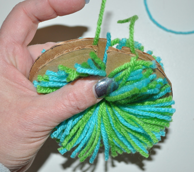Next I sandwiched my two circle templates together and wound my yarn as shown around and around, using the open slit to more easily get it in place. Keep winding until it is pretty full all around. The more you wind, the fluffier the pom pom.