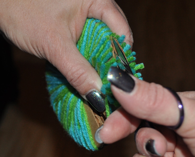 Hold the yarn/templates firmly in the center while cutting all around the outside edge. You are cutting in the groove between the two cardboard templates. Be careful not to let the yarn slip off while you thread your yarn tie between the two templates. (It helps to have another set of hands if someone is available, but I was able to do this by myself.)