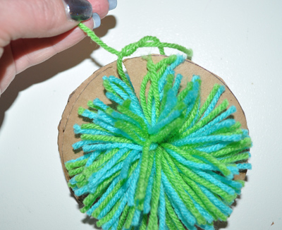 Once you tie the center yarn securely, you can pull your pom pom loose from the template. This is also where the slit comes in handy.
