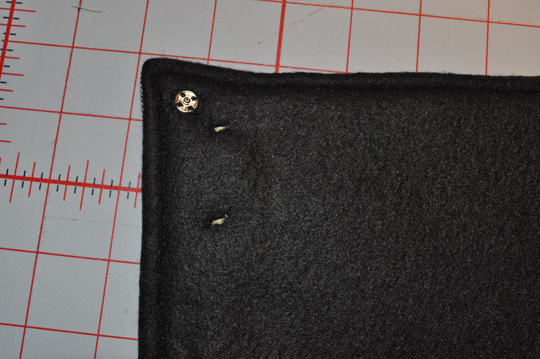 Sew the post section of your snap on the back (fleece side) in the upper left corner.